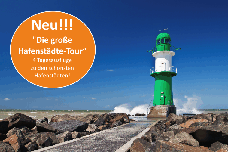 Vier unvergessliche Tagesausflüge führen Sie zu den bekanntesten und beeindruckendsten Hafenstädten. Unsere Ziele sind u.a.: Wismar, die UNESCO Welterbe- und zweitgrößte Hafenstadt Mecklenburg-Vorpommerns, mit ihrer historischen Altstadt. Lübeck, die „Königin der Hanse“, mit ihrer bezaubernden UNESCO-Welterbe-Altstadt. Schwerin, zur Residenzstadt der Großherzöge von Mecklenburg. Hansestadt Rostock mit 800 Jahren, einer der ältesten Hansestädte. Hamburg, „Das Tor zur Welt“, einer der größten deutschen Seehäfen. Bekannt durch Fischmarkt, Reeperbahn, Elphi u.v.m.